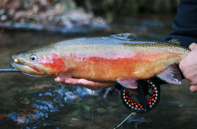 into our local streams , solid fish are not shy in taking bright colored egg patterns early morning.